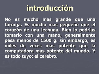 El documento describe las principales características del cerebro humano, incluyendo su tamaño, número de neuronas, funciones de las diferentes partes, tipos de inteligencia, estilos de aprendizaje y la importancia de la alimentación y las emociones para el funcionamiento cerebral. Señala que el cerebro pesa alrededor de 1.5 kg y contiene aproximadamente 100 mil millones de neuronas, y que aprendemos a través de la vista, el oído, el tacto, el gusto y el movimiento.