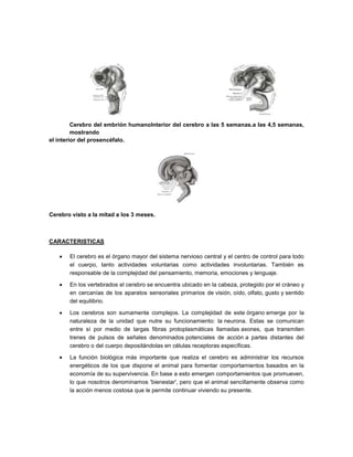 El documento describe la anatomía y función del cerebro humano. El cerebro es el órgano central del sistema nervioso que controla y regula las acciones del cuerpo. Está protegido dentro del cráneo y está compuesto de materia gris y blanca. El cerebro se divide en cuatro lóbulos y hemisferios izquierdo y derecho que se comunican a través del cuerpo calloso.