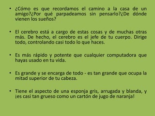 El cerebro es el órgano más importante del cuerpo que controla casi todas las funciones. Es más rápido que cualquier computadora y ocupa la mitad superior de la cabeza. Está compuesto de la corteza cerebral, que permite la inteligencia humana, y áreas como el área motora que controla los músculos. Aunque dormimos, el cerebro sigue trabajando procesando la información del día a través de los sueños.