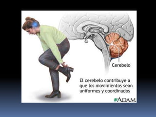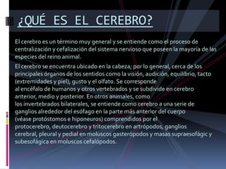 El cerebro es el órgano central del sistema nervioso ubicado en la cabeza que controla el cuerpo y procesa la información sensorial. Está compuesto de tres partes principales y contiene billones de neuronas que se comunican a través de conexiones llamadas sinapsis. El cerebro humano es extremadamente complejo y poderoso, superando a las computadoras actuales en capacidad de procesamiento y almacenamiento.