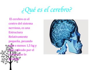El cerebro es el centro del sistema nervioso, se divide en dos hemisferios - el derecho y el izquierdo. Cada hemisferio se divide en cuatro lóbulos y contiene neuronas, las células fundamentales del sistema nervioso que transmiten información a través de neurotransmisores. El sistema nervioso central incluye el cerebro y la médula espinal, mientras que el sistema nervioso periférico incluye los nervios craneales y espinales que conectan el sistema nervioso central con el resto del cuerpo.