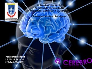 El documento describe la estructura y función del cerebro humano. El cerebro está compuesto de materia gris y blanca y está dividido en tres partes principales: el tallo cerebral, el cerebelo y el cerebro propiamente dicho. La corteza cerebral se divide en dos hemisferios que controlan lados opuestos del cuerpo y están involucrados en funciones como el lenguaje y las emociones. Cada hemisferio se divide a su vez en cuatro lóbulos que desempeñan funciones específicas como la percepción, memoria y razonamiento.