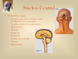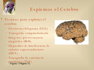 El documento describe las diferentes partes del cerebro y técnicas para explorarlo. Explica que el cerebro está dividido en el cerebro viejo, que controla funciones básicas, y el cerebro nuevo o corteza cerebral, responsable del procesamiento más complejo. También describe el sistema límbico, relacionado con las emociones, y las áreas funcionales de la corteza, incluyendo las motrices, sensoriales y de asociación. Finalmente, señala que el cerebro está dividido en hemisferios izquierdo y derecho que controlan l