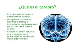 El documento describe la anatomía y función del cerebro humano. El cerebro está formado por dos hemisferios cerebrales conectados por el cuerpo calloso. Cada hemisferio controla el lado opuesto del cuerpo. La corteza cerebral contiene áreas sensoriales, motoras y de asociación que procesan la información sensorial, controlan el movimiento y realizan funciones cognitivas superiores respectivamente. El cerebro es responsable de funciones como el pensamiento, la memoria, el lenguaje y la toma de decisiones.