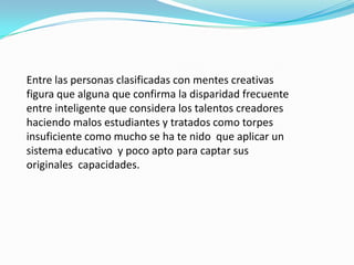 Este documento trata sobre la creatividad e inteligencia. Explica que la creatividad y la inteligencia son capacidades distintas y que las personas altamente creativas no necesitan tener un alto índice de inteligencia. También discute si los tests de inteligencia miden realmente la inteligencia y explora los orígenes de la inteligencia creativa, si es mutable o no, y define la creatividad.