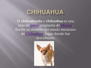 El documento describe tres razas de perros: el perro doméstico en general, el chihuahueño originario de México, y el beagle de tamaño pequeño a mediano similar al foxhound pero más pequeño con patas y orejas más largas.
