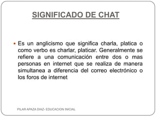 El documento describe el significado, uso social e historia del chat. Explica que el chat se refiere a una comunicación en línea entre dos o más personas de manera simultánea, a diferencia del correo electrónico. Detalla que los primeros chats se basaban en protocolos IRC, pero luego surgieron aplicaciones de mensajería instantánea como MSN, Yahoo Messenger e ICQ. Finalmente, señala que el chat se ha vuelto ampliamente utilizado debido a que permite una comunicación efectiva, rápida y gratuita.
