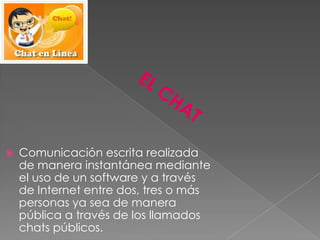 El chat permite la comunicación escrita instantánea entre dos o más personas a través de Internet utilizando software de mensajería como Windows Live Messenger, Yahoo Messenger, ICQ, etc. Los usuarios del chat a menudo usan seudónimos y el chat ha evolucionado para incluir funciones como videochat. Algunos ejemplos populares de servicios de chat son Latinchat, Starmedia, Yahoo, Microsoft Chat y Messenger.