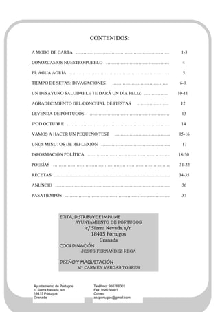 Este documento es un artículo escrito por Antonio Torres para la revista del Ayuntamiento de Pórtugos. En él, Torres resume la historia de los Juegos Olímpicos desde su origen en la antigua Grecia hasta la actualidad, destacando la importancia de los recientes Juegos Paralímpicos de Pekín. Además, felicita a Manuel Martín, doble medallista de bronce en boccia, por ser el primer embajador de Pórtugos en el mundo y ser un ejemplo de superación.