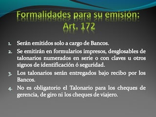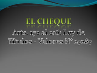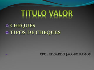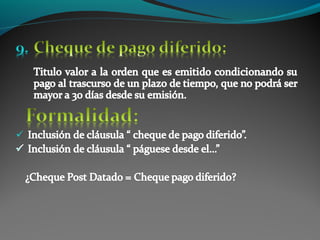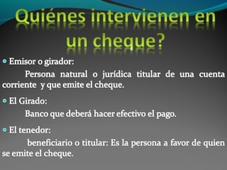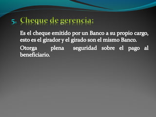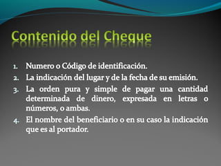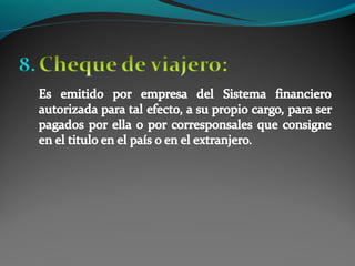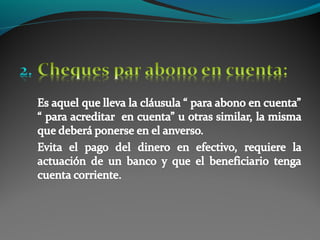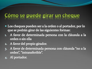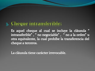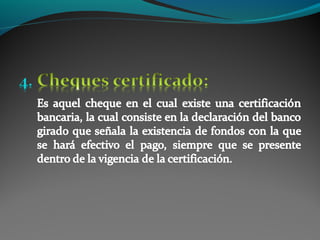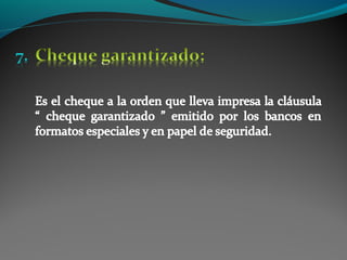 Este documento presenta diferentes modelos de cheques y sus características. Describe cheques cruzados, cheques para abono en cuenta, cheques intransferibles, cheques certificados, cheques de gerencia, cheques giro, cheques garantizados, cheques de viajero y cheques de pago diferido.