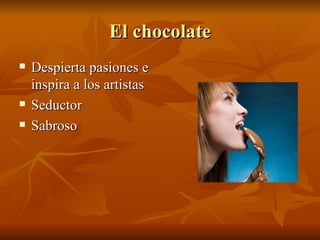El documento describe los múltiples beneficios del chocolate para la salud y el estado de ánimo. El chocolate contiene sustancias como la teobromina, cafeína y feniletilamina que estimulan el sistema nervioso y producen sensaciones de placer. También contiene triptófano, que favorece la producción de serotonina y mejora el estado de ánimo, y compuestos antioxidantes que pueden reducir el riesgo de enfermedades cardíacas y cáncer. Además, el chocolate aporta nutrientes como el potas