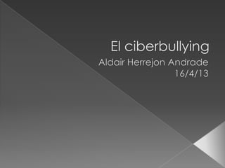 El documento habla sobre el ciberacoso o ciberbullying, que es el acoso psicológico entre iguales a través de Internet, teléfonos móviles y videojuegos online. Algunas consecuencias del ciberacoso son la depresión, el estrés y la revelación de información personal a desconocidos. El documento también proporciona algunas estrategias para hacer frente al ciberacoso, como identificar el problema, documentar las agresiones y desactivarse emocionalmente.