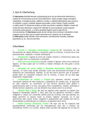 El documento habla sobre el ciberacoso o ciberbullying. Explica que es el uso de la tecnología como correos electrónicos y redes sociales para acosar a otros. Describe las formas comunes de ciberbullying como mensajes y amenazas, robo de identidad, y publicar contenido dañino. También menciona lugares para denunciar casos de ciberbullying y características comunes en víctimas como cambios de comportamiento, tristeza e irritabilidad.