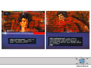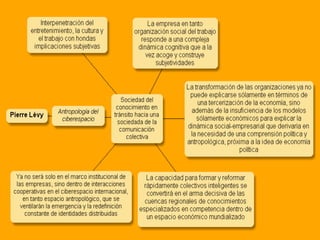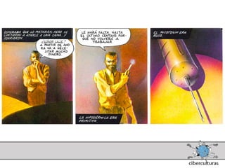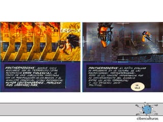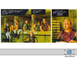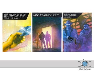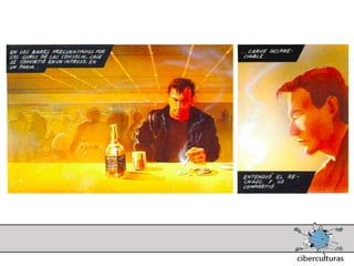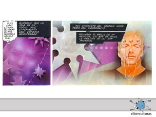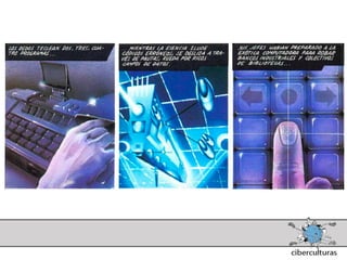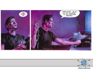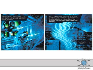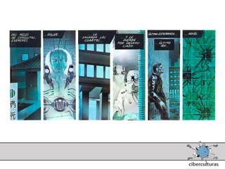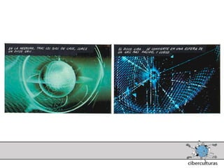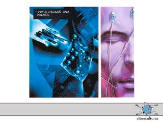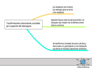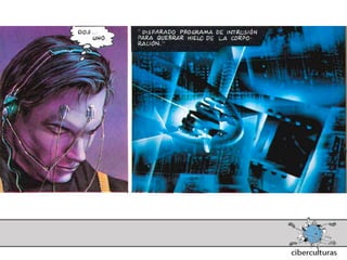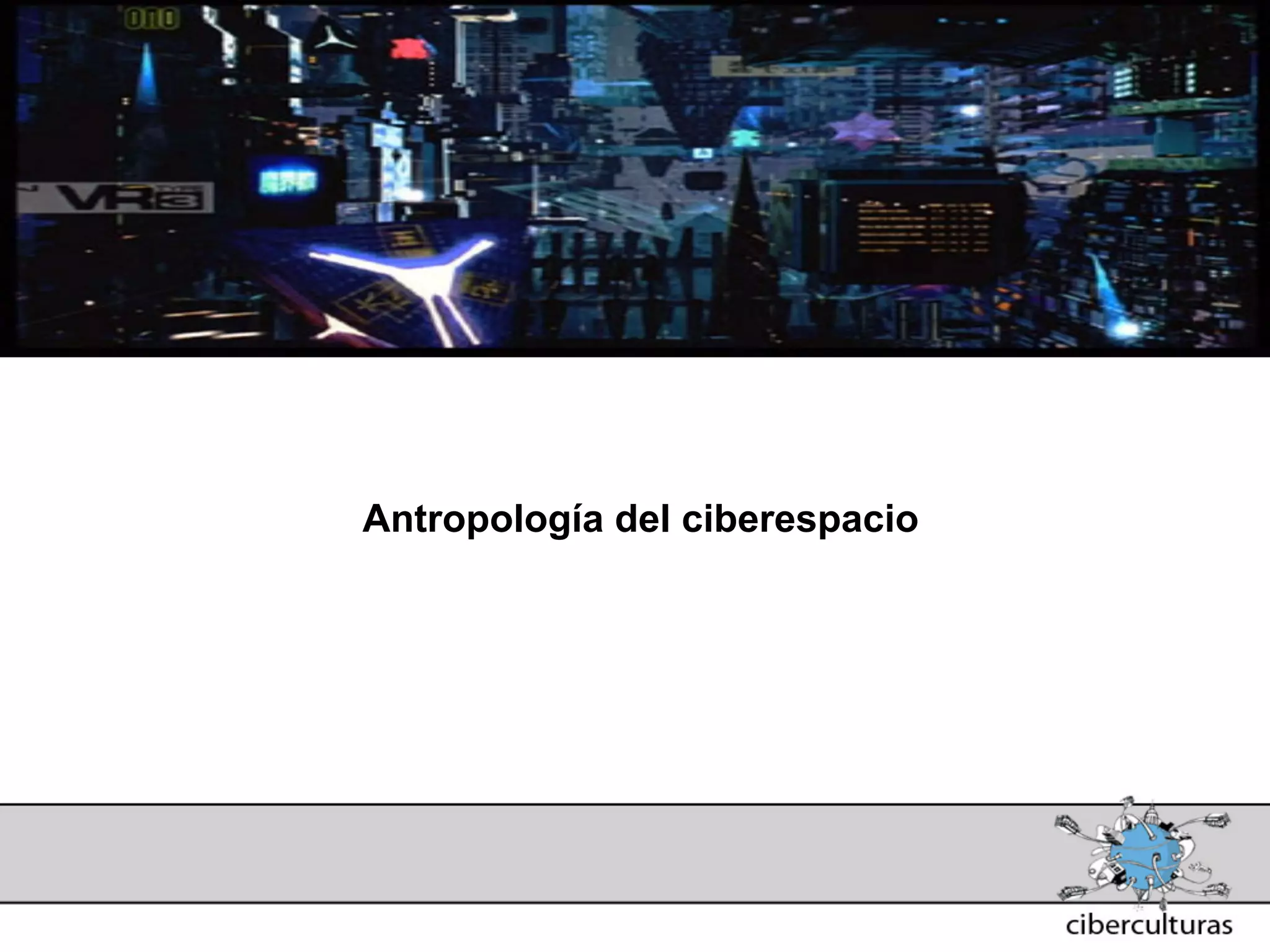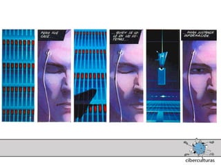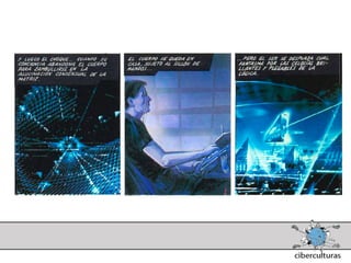 El documento presenta diferentes perspectivas sobre el concepto de ciberespacio. Brevemente resume las ideas de Marshall McLuhan sobre cómo los medios electrónicos amplían nuestro sistema nervioso, de William Gibson acuñando el término "ciberespacio" en su novela Neuromante para describir un universo de redes numéricas, y de John Perry Barlow sobre el ciberespacio formado por transacciones y pensamientos extendidos a través de las comunicaciones. También incluye extractos de la novela Neuromante sobre un ladrón de sistemas llamado Case traba