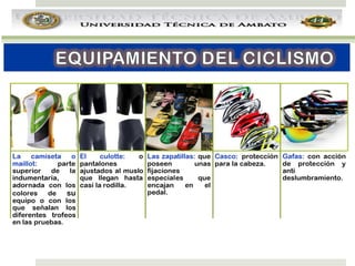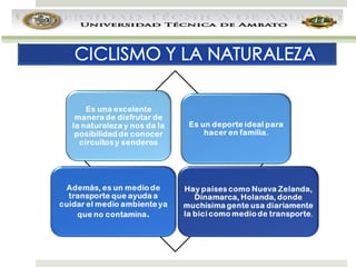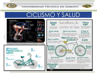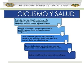 El documento presenta información sobre el ciclismo como tema de estudio. Brevemente describe que el ciclismo es un deporte popular que incluye varias modalidades como el ciclismo en ruta, en pista, de montaña, BMX y recreativo. Además, explica los elementos básicos de una bicicleta y algunos términos relacionados al ciclismo.
