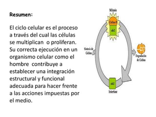El documento resume el ciclo celular, sus alteraciones en el cáncer y cómo es regulado en las células madre embrionarias. Explica que el ciclo celular es el proceso a través del cual las células se multiplican o proliferan de forma correcta en un organismo. Describe las cuatro fases del ciclo celular (G1, S, G2, M) y cómo varía la duración entre diferentes tipos de células. También cubre brevemente el cáncer y las células madre.