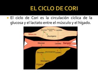 El ciclo de Cori es la circulación cíclica de la glucosa y el lactato entre el músculo y el hígado, permitiendo que las células musculares produzcan energía a través de la glucólisis anaeróbica en condiciones de hipoxia. El lactato producido en los músculos es transportado al hígado y convertido de nuevo en glucosa a través de la gluconeogénesis, la cual regresa a los músculos.