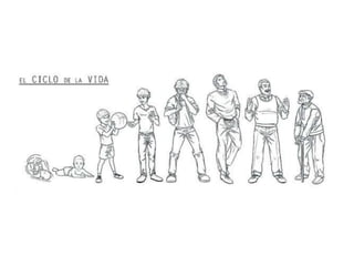 El documento habla sobre las diferentes etapas de la vida humana, incluyendo la lactancia, la pubertad, la vejez y los créditos de las imágenes utilizadas. Brevemente describe que la vejez comienza con el declive de las funciones del cuerpo y luego proporciona créditos a varias imágenes de Flickr.