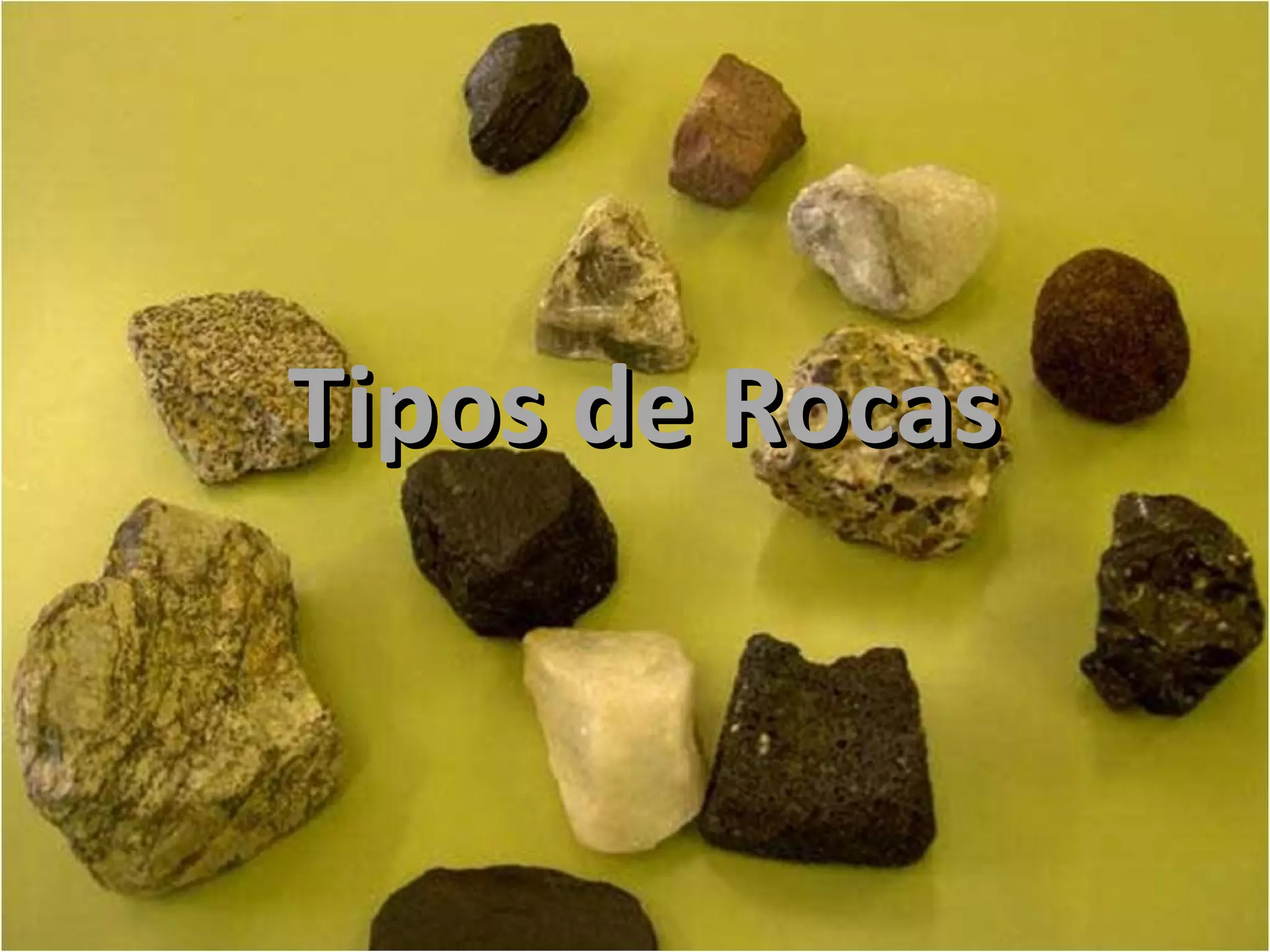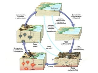 Este documento describe los tres tipos principales de rocas: 1) Rocas ígneas o magmáticas, que se forman por el enfriamiento del magma; 2) Rocas sedimentarias, que se forman por la compactación de sedimentos; y 3) Rocas metamórficas, que se forman por cambios en rocas preexistentes debido a altas presiones y temperaturas.