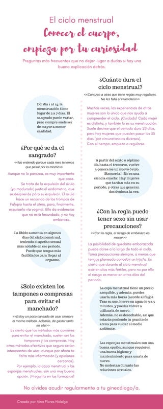 El documento habla sobre el ciclo menstrual femenino. Explica que el periodo suele durar 28 días aunque puede variar entre mujeres e incluso en la misma mujer. Describe que durante el ciclo se produce la maduración y expulsión del óvulo así como del revestimiento del útero si no se produce la fertilización. Recomienda tomar precauciones a lo largo de todo el ciclo aunque hay días más fértiles y menciona otros métodos para la higiene además de tampones y compresas como la copa menstrual y las esponjas.