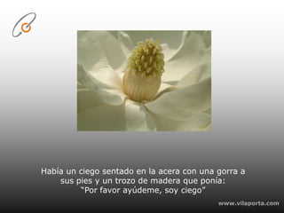Un ciego mendigaba con poco éxito en la acera hasta que un creativo de publicidad modificó su letrero para enfatizar su ceguera y la primavera que no podía ver, llenando su gorra de donaciones; el ciego nunca supo el nuevo mensaje pero apreció los resultados.