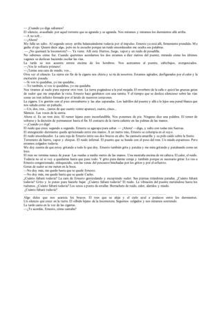 El cuento describe una tarde que dos amigos, Ernesto y el narrador, pasan juntos caminando y explorando los alrededores. Juegan y se ríen juntos, luego deciden colgarse de un puente para ver pasar un tren. Cuando el tren se acerca, sienten mucho miedo pero se quedan colgados hasta que pasa completamente. Al final, el tren se va y ellos se quedan sonriendo, felices de haber compartido esa aventura juntos.