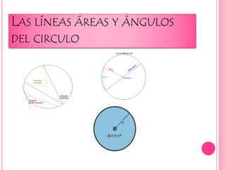 Este documento describe las líneas y ángulos del círculo. Explica que un círculo contiene infinitas circunferencias, con la más importante siendo la circunferencia exterior que delimita el círculo. Luego describe varias figuras geométricas como sector circular, segmento circular, semicírculo y corona circular que están delimitadas por arcos y circunferencias del círculo. Finalmente, explica los diferentes tipos de ángulos que pueden formarse en un círculo, incluyendo ángulos centrales, ángulos inscritos