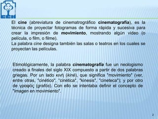 Este documento explica los conceptos básicos del lenguaje cinematográfico, incluyendo el fotograma, el encuadre, diferentes tipos de planos como plano general, primer plano y plano secuencia, movimientos de cámara, angulaciones, montaje e inserto. Define estos elementos técnicos y describe su uso para crear efectos narrativos y expresivos en las películas.