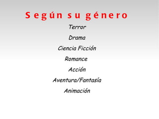 El documento resume varios géneros cinematográficos como terror, drama, ciencia ficción, romance, acción, aventura/fantasía y animación. Para cada género, describe brevemente su evolución y algunas películas representativas, incluyendo críticas o comentarios sobre las mismas.