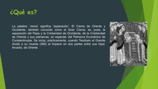 El documento describe el Cisma de Oriente y Occidente, también conocido como el Gran Cisma, que fue la separación de la Iglesia Católica de Roma y la Iglesia Ortodoxa de Oriente en 1054 d.C. Las causas principales del cisma incluyeron diferencias étnicas y religiosas entre las iglesias del este y el oeste, así como disputas sobre jurisdicción eclesiástica y la intromisión de los emperadores bizantinos en asuntos religiosos. Aunque el cisma formal comenzó en 1054, sus ra