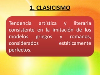 Este documento describe el clasicismo como la primera corriente literaria universal que tomó a Grecia y Roma como modelos estéticos perfectos. Se caracterizó por buscar la belleza, intelectualidad y armonía entre el fondo y la forma. En el período jónico, época formativa, destacan los géneros épico y didáctico. Homero escribió la Ilíada y la Odisea, epopeyas fundacionales, mientras que Hesíodo representó la poesía didáctica con obras como Los trabajos y