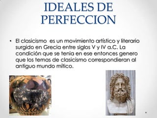 El documento describe el movimiento artístico y literario del Clasicismo que surgió en Grecia entre los siglos V y IV a.C., caracterizado por la fidelidad a la naturaleza, el orden, la armonía y la perfección. Los romanos adoptaron la cultura helénica incluyendo sus características artísticas. La poesía griega celebraba las hazañas guerreras y era cantada por los aedos, mientras que el teatro nació de las fiestas en honor a Dionisio introduciendo el diálogo entre personajes