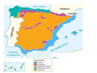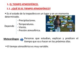 Este documento describe los conceptos de tiempo atmosférico, clima y zonas climáticas. Explica que el tiempo atmosférico se refiere al estado de la atmósfera en un lugar y momento determinados, y depende de factores como la temperatura, precipitación, viento y presión. El clima se define como las características meteorológicas de una zona a lo largo de un largo período de tiempo. La Tierra tiene tres zonas climáticas principales: frías, templadas y cálidas. Finalmente, se mencionan los princip