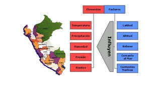 El documento aborda diversos aspectos del clima en Perú, incluyendo elementos y factores que influyen en las características climáticas regionales. También se presentan clasificaciones de climas según el MINAGRI y se analizan fenómenos climáticos como el fenómeno de El Niño y el friaje, junto con sus consecuencias y medidas preventivas. Se incluyen datos históricos sobre variables climáticas en la selva peruana y bibliografía relevante para el estudio de la climatología.