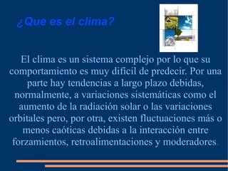 Este documento trata sobre el clima y los factores que lo afectan. Explica que el clima es un sistema complejo influenciado por factores naturales como la latitud, altitud, corrientes marinas y vegetación. Además, señala que los mejores modelos climáticos no pueden tener en cuenta todas las variables y solo permiten predecir el clima a corto plazo. Por último, indica que el conocimiento del clima pasado se basa en registros como sedimentos, anillos de árboles y burbujas de hielo polar.