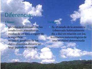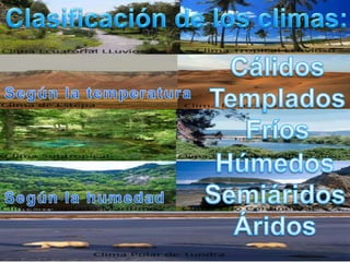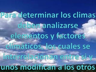 El documento describe los factores que influyen en el clima de Argentina, incluyendo la energía solar, la latitud, la altitud, la continentalidad, los vientos y la Cordillera de los Andes. Explica que la desigual distribución de la energía solar causa diferentes climas como cálidos, templados y fríos. También describe las variedades regionales de cada clima en Argentina.