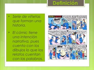 Este documento define el cómic y describe sus características y elementos fundamentales. Explica que el cómic es una serie de viñetas que cuentan una historia a través de dibujos y palabras. Describe las características del cómic como su naturaleza narrativa, el uso de lenguaje verbal e imágenes, y códigos propios. Además, detalla los elementos básicos del cómic como la viñeta, los diferentes planos, los formatos como el bocadillo y la cartela, y el uso de la onomatopeya.