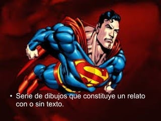 El cómic es una serie de dibujos que cuentan una historia con o sin texto. El primer cómic se publicó en 1883 en un periódico de Nueva York y presentaba a Yellow Kid, un pillastre con dientes separados vestido de amarillo. La historia se representa a través de viñetas sucesivas donde se encuentran los personajes, texto y detalles, y los bocadillos recogen el diálogo variando por el sentimiento expresado mientras la onomatopeya imita sonidos dentro o fuera de los bocadillos.