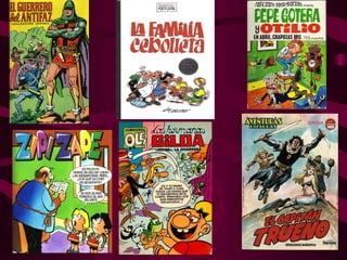 El documento habla sobre el origen y los elementos básicos del cómic. Explica que el cómic surgió a finales del siglo XIX como serie de viñetas que narraban una historia a través de dibujos e imágenes. Señala que el cómic moderno tomó forma en 1893 con la historieta estadounidense "The Yellow Kid", la cual integraba texto e imágenes. Asimismo, describe los principales géneros de cómics como los superhéroes y algunos de los elementos constitutivos de este medio como las viñ