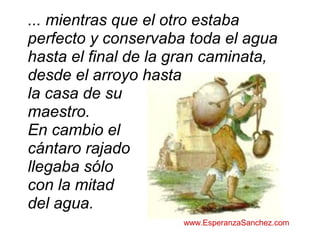 Un repartidor de agua en la India llevaba agua en dos cántaros, uno perfecto y otro agrietado. El cántaro agrietado solo podía transportar la mitad del agua debido a sus grietas, lo que avergonzaba al cántaro. Sin embargo, el repartidor le explicó que había sembrado flores a lo largo del camino para regarlas con el agua que escapaba de las grietas, permitiéndole decorar el altar de su maestro con las flores.