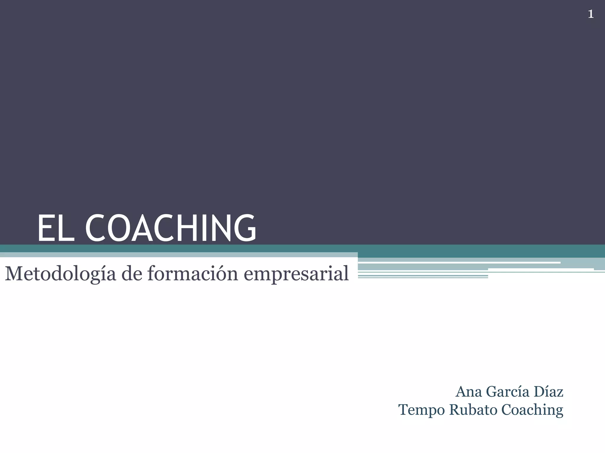 El coaching es una metodología de formación que busca ayudar al cliente (coachee) a alcanzar sus objetivos a través de su propio autodescubrimiento en un proceso guiado por un coach. El coaching puede enfocarse en negocios, liderazgo o desarrollo personal y ofrece oportunidades laborales en empresas, educación y consultorías. Los clientes típicos son hombres entre 30-50 años en posiciones de liderazgo que buscan mejorar a través de una relación igualitaria y motivadora con su coach.