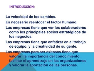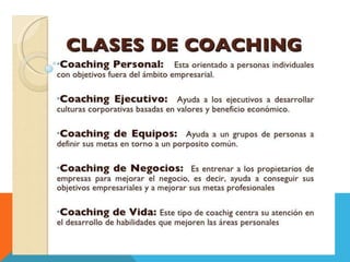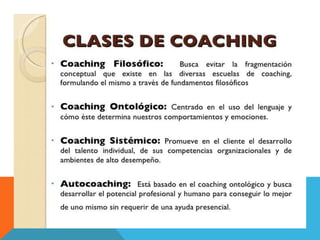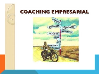 El documento habla sobre el coaching empresarial. Explica que es necesario reenfocar el factor humano y ver a los empleados como socios estratégicos. También describe qué es el coaching, cómo ayuda a las personas y empresas a lograr el éxito, y los pasos involucrados en el proceso de coaching. Finalmente, discute las herramientas e instrumentos del coaching y la diferencia entre coaching y asesoramiento.