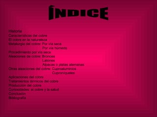 Este documento resume las características, usos y procesos de obtención del cobre. Explica que el cobre es un metal no férreo de color rojizo con alta conductividad eléctrica y térmica. Forma aleaciones como bronces y latones usadas en electricidad, transporte y construcción. Se extrae principalmente de minerales sulfurados mediante procesos de vía seca o húmeda y es necesario en la vida humana y ecosistemas.
