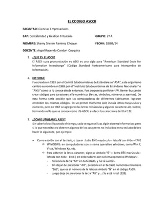 El documento explica el código ASCII, incluyendo su historia, propósito y uso. El ASCII fue creado en 1963 para estandarizar los códigos de caracteres entre computadoras de diferentes fabricantes, permitiendo la interoperabilidad. Originalmente solo incluía letras mayúsculas y números, pero se expandió en 1967 para incluir letras minúsculas y caracteres de control. El documento también proporciona ejemplos de cómo obtener caracteres especiales como 'Ñ' usando códigos ASCII en Windows.