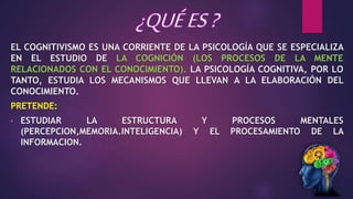 El cognitivismo es una corriente psicológica que estudia los procesos mentales relacionados con el conocimiento, como la percepción, memoria e inteligencia. Se enfoca en comprender cómo se produce el aprendizaje a través de métodos experimentales y la observación de procesos cognitivos. Considera al individuo como un procesador activo de información y constructor de su propio conocimiento a través de la asimilación y acomodación.