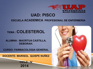 Este documento trata sobre el colesterol. Explica que la hipercolesterolemia es una elevación anormal de los niveles de colesterol en la sangre sobre los 250 mg/dL y puede causar enfermedades cardíacas. Describe las causas del colesterol alto como la obesidad, estrés y falta de ejercicio, así como los síntomas. Finalmente, recomienda un tratamiento basado en dieta, ejercicio y en algunos casos medicamentos para reducir los niveles de colesterol.