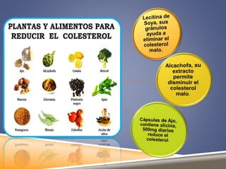 El documento aborda el colesterol y la hipercolesterolemia, definiendo el aumento de colesterol en sangre y sus consecuencias para la salud, como infarto agudo de miocardio, insuficiencia cardiaca e hipertensión. Se indican factores de riesgo como obesidad, sedentarismo y alimentación inadecuada, así como recomendaciones dietéticas y farmacológicas para su control. Las sugerencias incluyen la reducción de grasas saturadas, aumento del consumo de frutas y ejercicios físicos regulares.