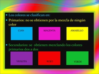 El documento clasifica los colores en primarios y secundarios, explica que los primarios no se obtienen de la mezcla de otros colores mientras que los secundarios sí. Describe el círculo cromático y las cualidades del color como el tono, valor y saturación. Explica conceptos como gamas cromáticas, policrocía, monocromía y las relaciones armónicas entre colores afines y complementarios.