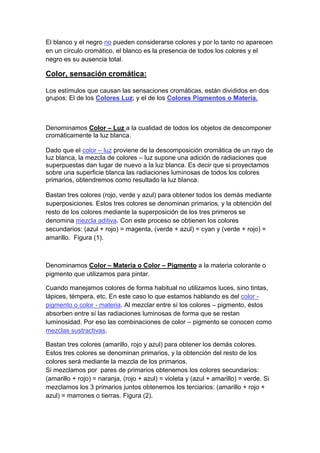 El color surge de la refracción y reflexión de la luz. Los objetos reflejan ciertas longitudes de onda dándoles su color característico, mientras absorben el resto. El color es percibido por el ojo humano y depende de factores físicos como la longitud de onda de la luz. Existen colores primarios, secundarios y terciarios que surgen de diferentes combinaciones de la luz o de pigmentos.