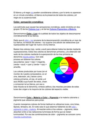 El color aparece como un fenómeno de refracción y reflexión de la luz. Los objetos absorben un conjunto de ondas luminosas y reflejan aquella que le da su color característico. Existen colores primarios, secundarios y terciarios, y el círculo cromático ordena los colores y sus mezclas. El color tiene dimensiones como el tono, valor y saturación y puede usarse simbólicamente.